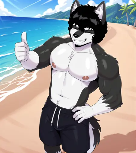 Lobo_(Lobokosmico), wolf boy, male wolf, black fur, white fur, two-tone fur, short hair, black hair, purple eyes, thick eyebrows, white eyebrows, muscular, huge penis, thick penis, black penis, big testicles, testicles