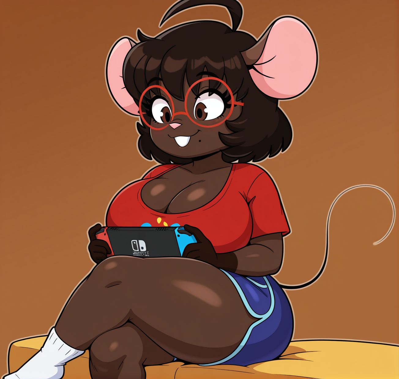 Gwen Martin, mouse girl, female mouse, pink nose, dark-skinned female, dark skin, short hair, brown hair, ahoge, brown eyes, mole, mole under mouth, shortstack, short stack, short woman, thick thighs, wide hips, bottom heavy, big breasts, buck tooth, buck teeth