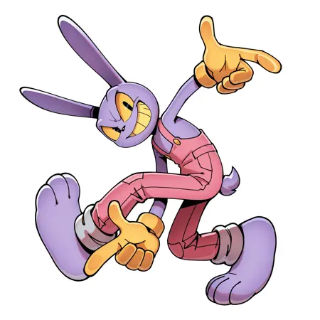 1boy, jax, 紫色毛发, 兔子耳朵, 黄色眼白, 黑色眼睛, 黄色牙齿, 黄色手套