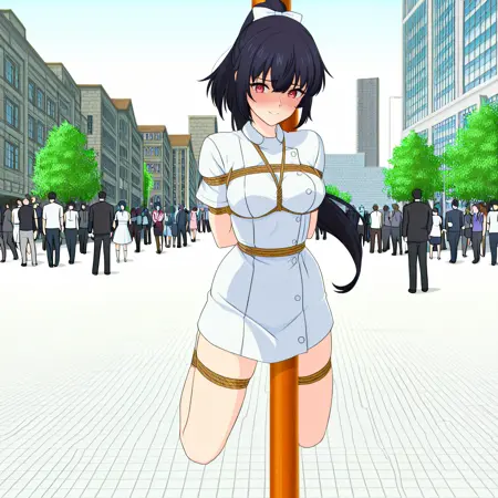 polesuspension, bound, shibari, 1girl, 绑在杆子上,广场,城镇,公开羞辱