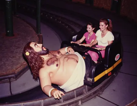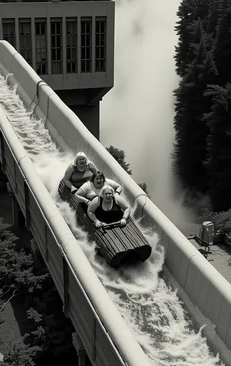 track-car, track in a room, a boat, a log, a car, a cart, splashing down, cheap painted plaster statue, made of plaster, object with a face on the front, painting on a wall, animatronic, log flume(称其为 water flume 或 water slide,而保留 log 用于指代人坐的物体)等