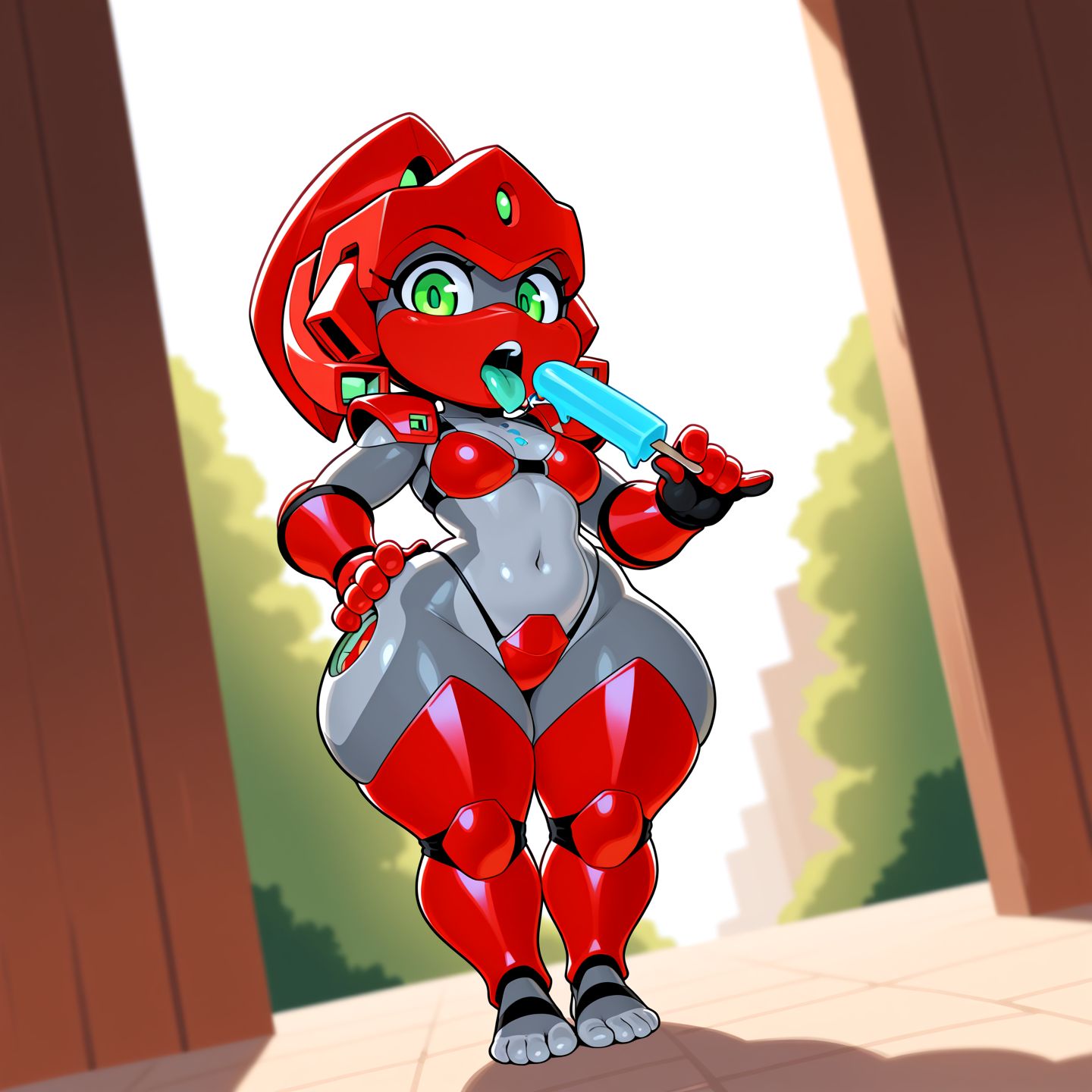 proxy_(pizzacat), robot, humanoid, cybernetics, cyborg, stirrup_(marking), not_furry, wide_hips, green_eyes