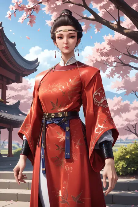 1girl, solo, jewelry, earrings, black hair, chinese clothes, belt, long sleeves, red dress