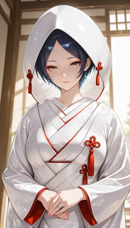 2.long sleeves, jewelry, earrings, japanese clothes, hood, wide sleeves, kimono, nail polish, makeup, floral print, ring, tassel, white kimono, wedding dress, wedding ring, bride, wedding, uchikake, ornate ring, wataboushi,