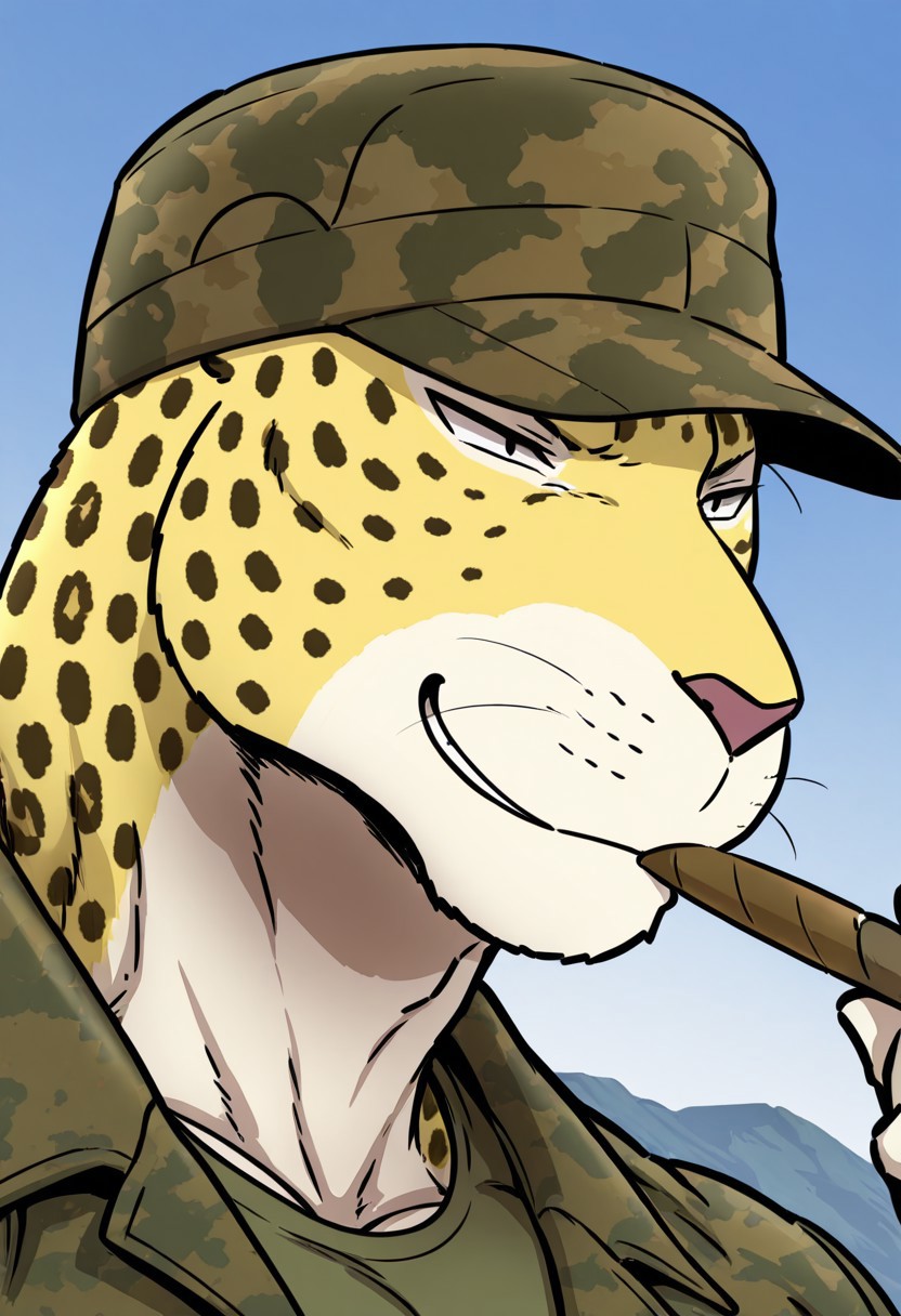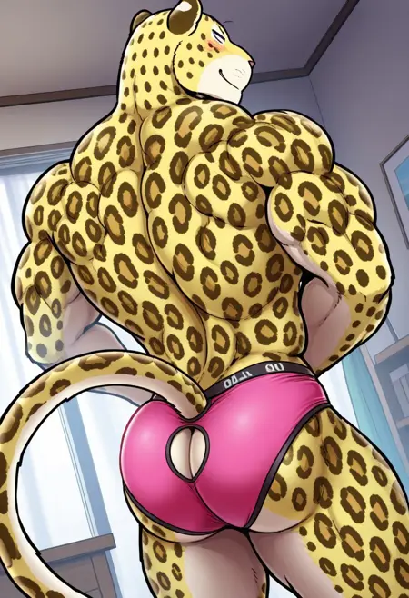 강화 프롬프트: 표범, 꼬리, 노란 털, 작은 눈, 검은 눈, 근육질, 남성적, 운동선수 같은 체형, 큰 유방근
