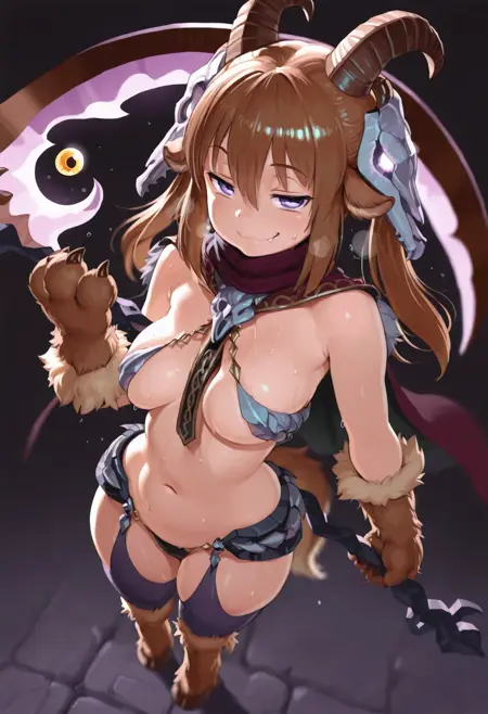 baphometmge, monster girl, animal ears, animal hands, goat horns, segmented horns, claws, hooves, horizontal pupils, fang, tail, paw gloves, fur