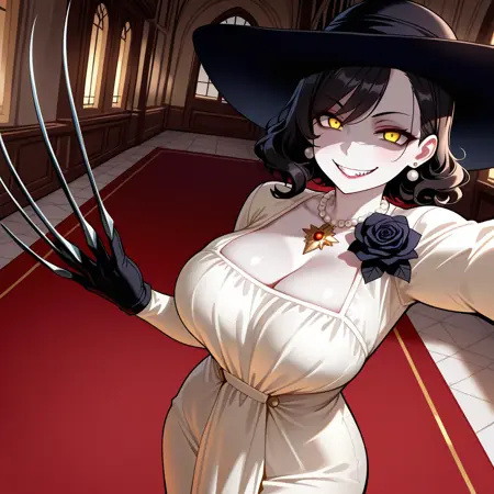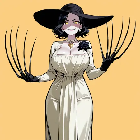 | Trained Words | Dimitrescu, 1girl, solo, mature female, colored skin, pale skin, white skin, tall female, yellow eyes, large breasts, black hair, wavy hair, black gloves, sun hat, earrings, pearl necklace, scoop neck, white dress, long dress, bursting breasts, black roseCopied! claws, claw (weapon)Copied! cigarette holder, smoke, smokingCopied! nude, colored nipples, female pubic hairCopied! underwear, panties, black thighhighs, bra, black bra, lace-trimmed bra, black panties, garter belt, elbow gloves, lingerie, underwear only, lace trimCopied! |