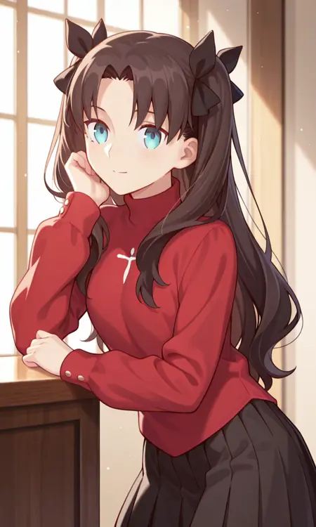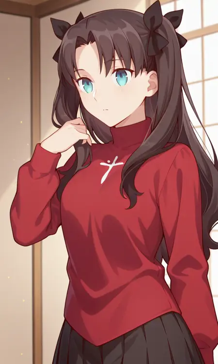 (에미야 가족을 위한 오늘의 메뉴) 도사카 리ン, 1girl, solo, 갈색 머리, 양쪽 위로 올린 머리, 중간 갈라진 앞머리, 파란 눈, 머리 리본, 검은 리본, 터틀넥 스웨터, 빨간 스웨터, 검은 치마, 긴 소매, 주름 치마