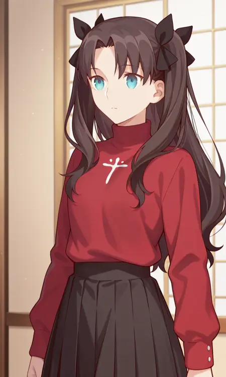 (今日卫宫家的菜单)远坂凛,1girl,单人,棕色头发,两侧上扎,中分刘海,蓝色眼睛,发带,黑色丝带,高领毛衣,红色毛衣,黑色裙子,长袖,百褶裙
