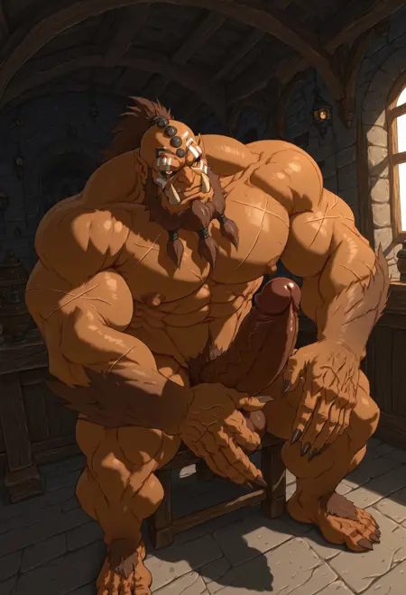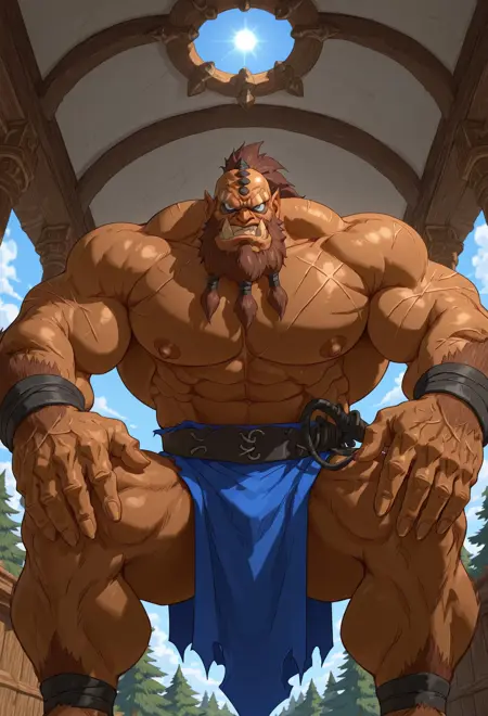 Beast, facial hair, brown hair, blue loin cloth, large muscles, tusks, pony tail, bald head, horns, body scars, hairy body, chiseled face