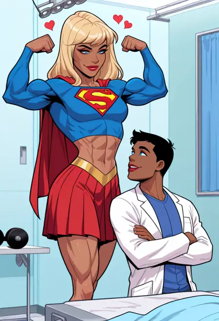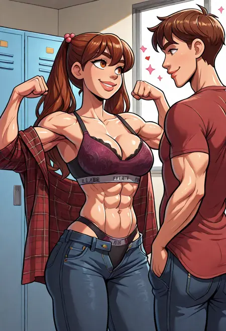 ZH_Muscl3Att3ntion、flexing、muscular female、smile、looking at another、(1boy/1girl/multiple boys/multiple girls)