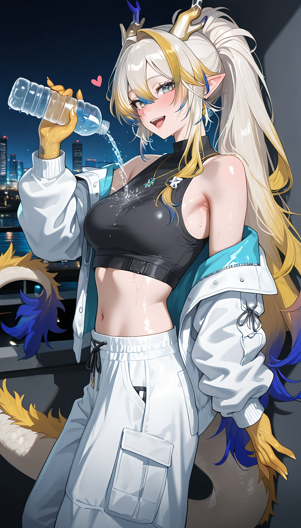 ShuLawson2, hair between eyes, very long hair, blonde hair, multicolored hair, streaked hair, gradient hair, ponytail, blue eyes, white hair, blue hair, dragon horns, pointy ears, dragon tail, white jacket, open jacket, black shirt, sleeveless shirt, crop top, off shoulder, white pants, baggy pants, colored extremities, yellow hands, necklace, earrings, hair ornament,