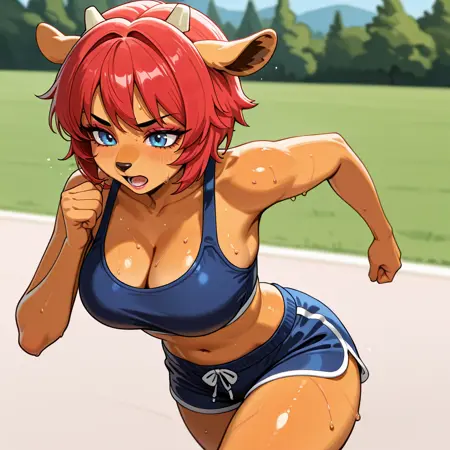 ファンアート用トリガー:LammyFanart, red shirt, animal ears, 1girl, blue eyes, star (symbol), furry female, pants, short hair, belt, midriff, jeans, red hair, makeup, short sleeves, crop top, watch
