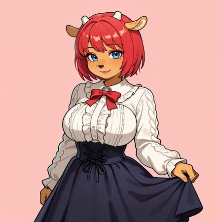 トリガー:Lammy, 1girl, t-shirt, red hair, pants, deer ears, short hair, jeans, belt