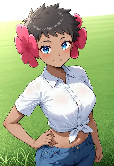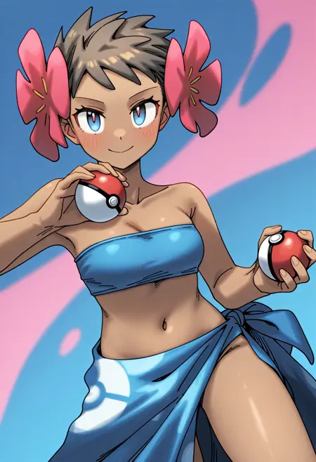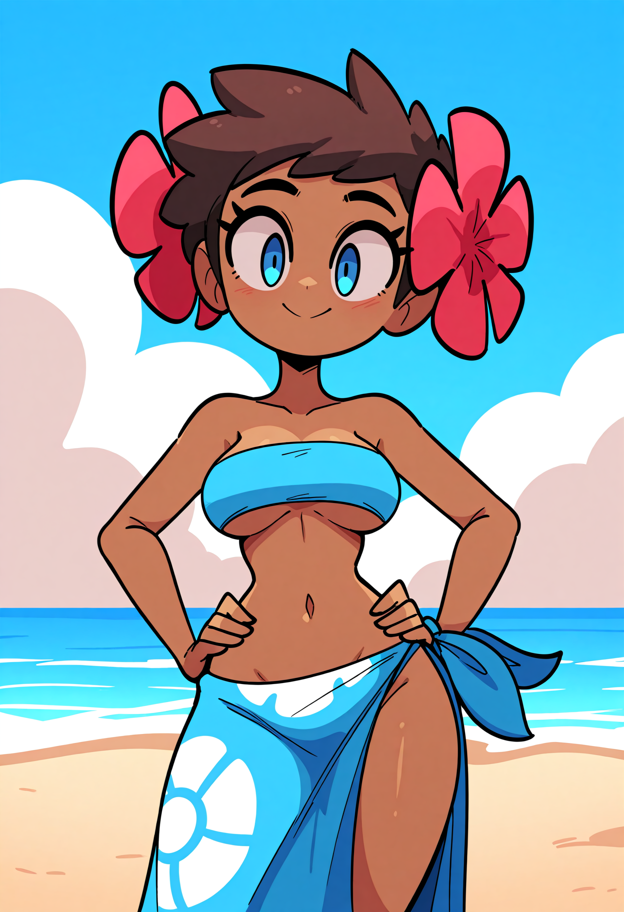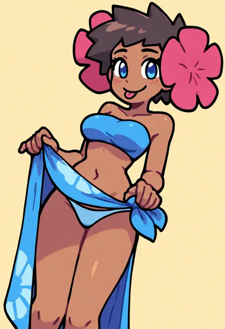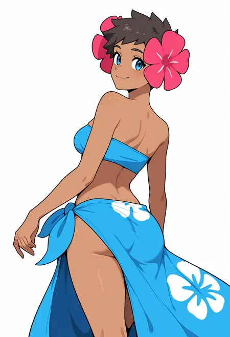 キーワードはphoebepkmnで、デフォルトの服装には:青い目、茶色の髪、短い髪、肌の黒い女性、髪に花、青いチューブトップ、青いサロングを使用してください。
