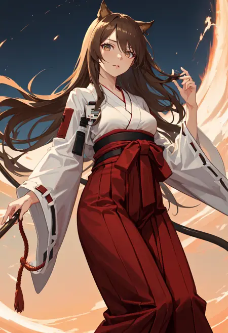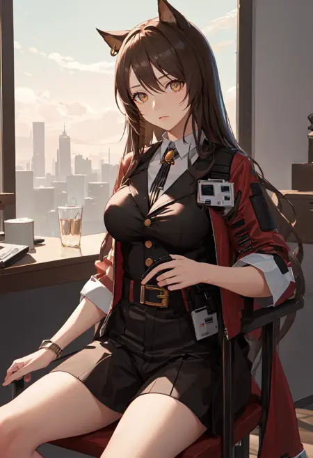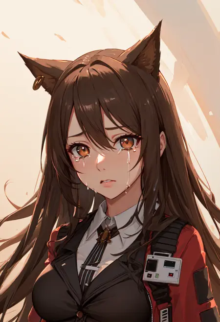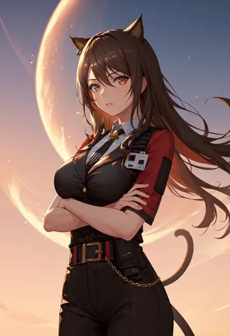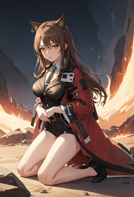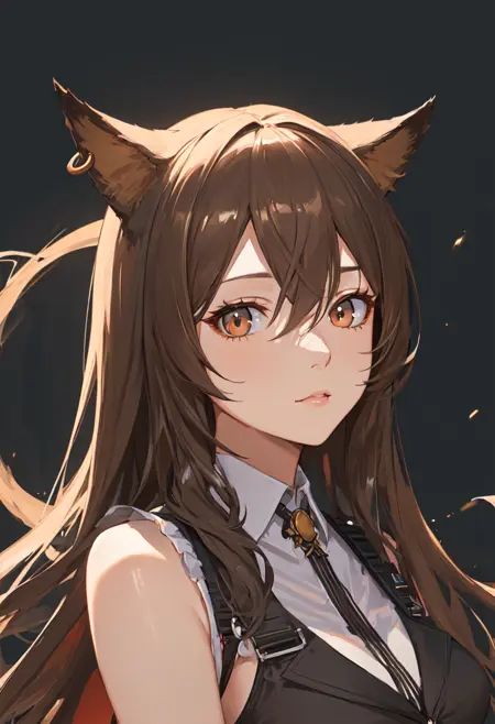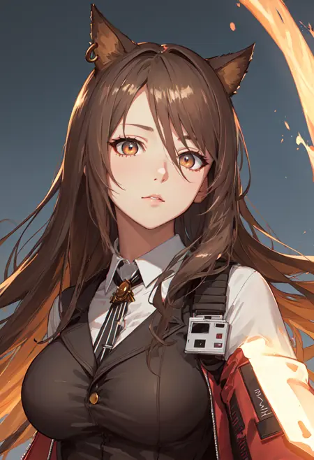 The trigger word is skyfire_arknights, and the pruned tags are long_hair, animal_ears, brown_hair, cat_ears, breasts, brown_eyes, tail, cat_tail, cat_girl, earrings, medium_breasts, large_breasts, hair_between_eyes. When some features (e.g. hair color) are not so stable at some times, you can add these them into your prompt.