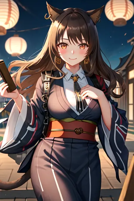 The trigger word is skyfire_arknights, and the pruned tags are long_hair, animal_ears, brown_hair, cat_ears, breasts, brown_eyes, tail, cat_tail, cat_girl, earrings, medium_breasts, large_breasts, hair_between_eyes. When some features (e.g. hair color) are not so stable at some times, you can add these them into your prompt.