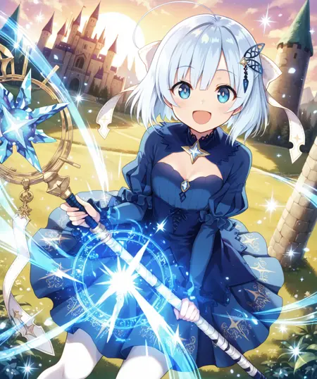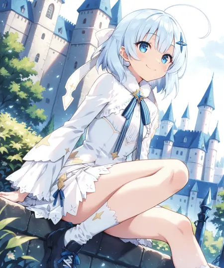 tina, blue eyes, light blue hair, short hair, ahoge, white hair bow, star hair ornament,