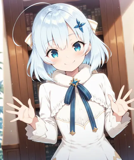 tina, blue eyes, light blue hair, short hair, ahoge, white hair bow, star hair ornament,