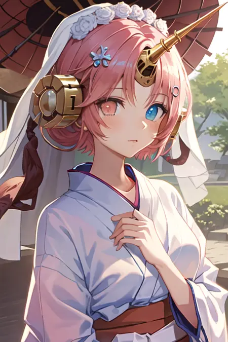 触发词为 frankenstein_fgo,推荐标签为:best quality, masterpiece, highres, solo, {frankenstein_fgo:1.15}, horns, single_horn, mechanical_horns, pink_hair, short_hair, blue_eyes, veil, breasts, yellow_eyes, heterochromia, hair_over_one_eye, hair_ornament。