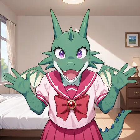 追加プロンプト:ドラゴン、アンスロドラゴン、緑のウロコ、白い腹、緑の角、翼、尾、紫の目、1girl、短い鼻先、丸い鼻先、丸い顔、眉なし、広い顎、大きな目