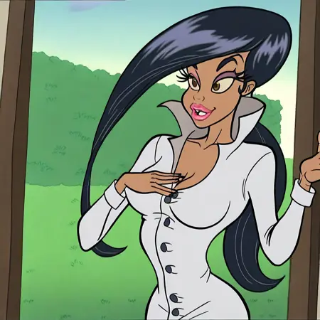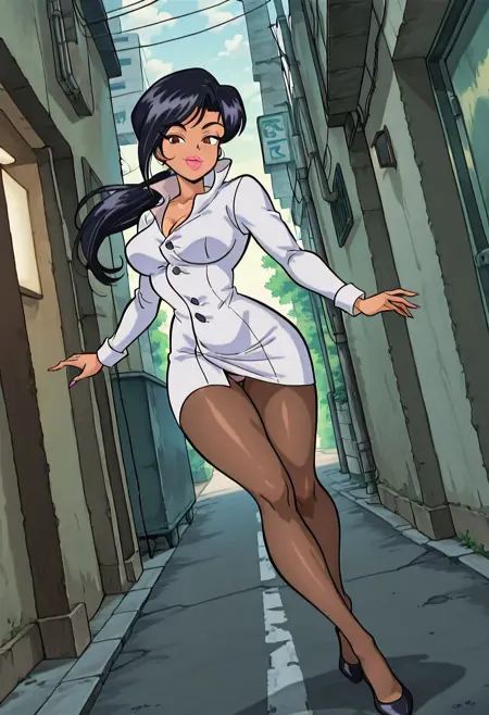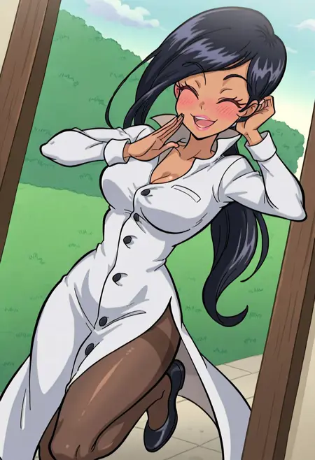 DrJeanPooleTRF, 1girl, solo, black hair, long hair, ponytail, bangs, brown eyes, lips, pink lipstick, makeup, dark skin, large breast, white lab coat, thick thighs, brown pantyhose, shoes, cleavage, popped collar, buttons, chest pocket,