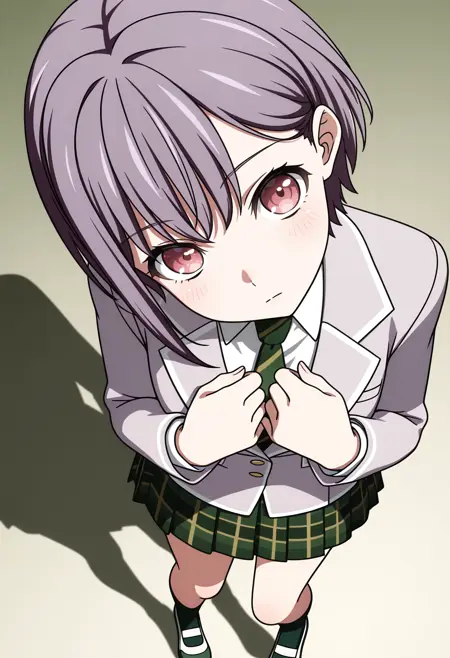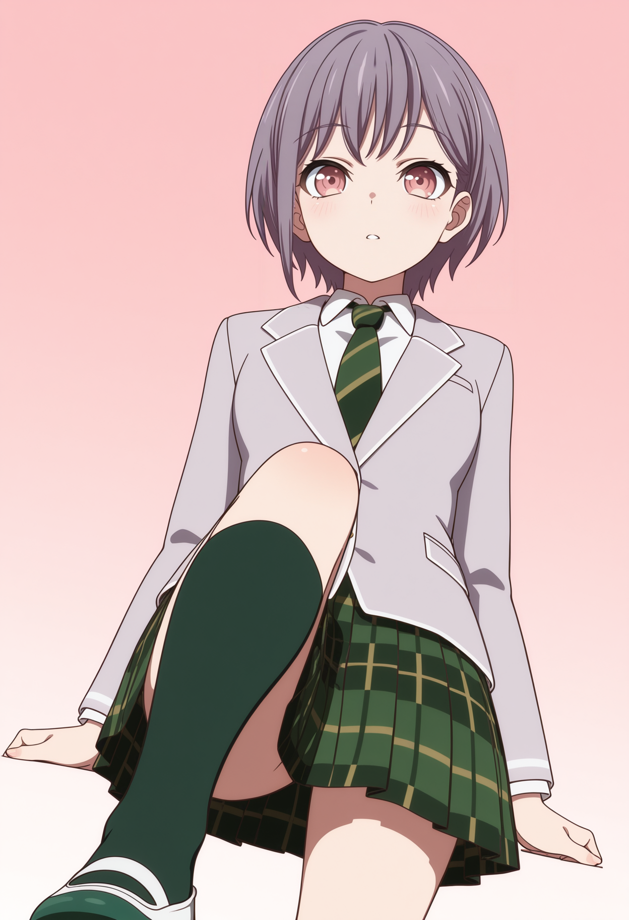 羽丘学园制服,绿色领带,斜条纹领带,有领衬衫,白色衬衫,灰色夹克,格子裙,百褶裙,绿色裙子,深绿色长袜,及膝袜,绿色室内鞋,