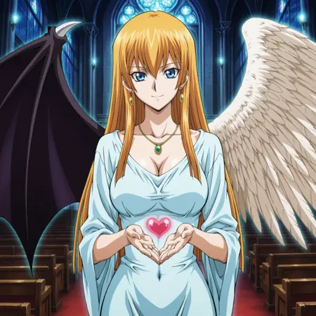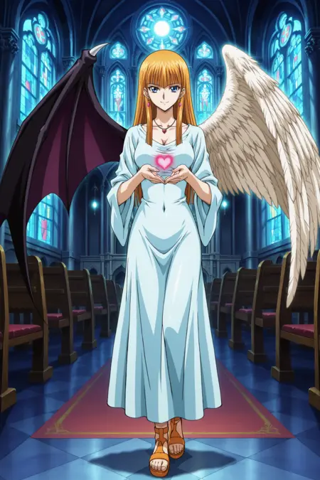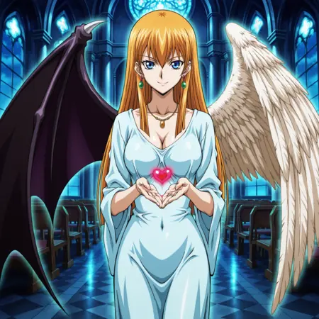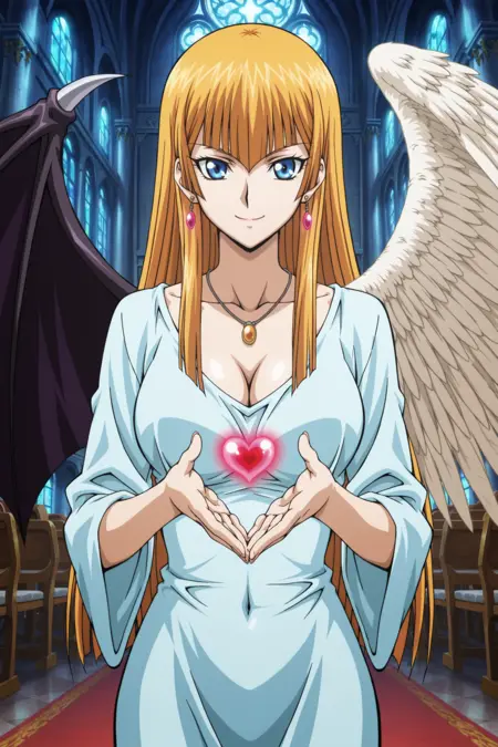 yugioh_card_style, yugioh_card_for_change_of_heart, blue eyes, long straight hair, golden hair, earrings, necklace, large breasts, collarbone, covered navel, cleavage, smile, half demon half angel, demon wing, black bat wing, angel wing, white feathered wing, asymmetrical wings, light blue robe, orange high heel sandals, open palm gesture, heart symbol in hand, glowing light from hand