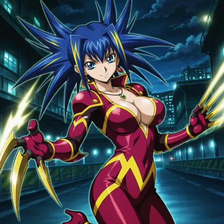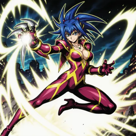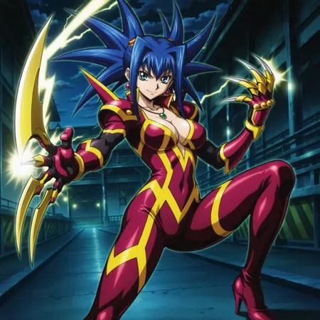yugioh_card_style, yugioh_card_for_rai_mei, blue eyes, blue hair, sharp bangs, long spiky hair, earrings, necklace, large breasts, collarbone, covered navel, cleavage, smile, helmet with fins, bodysuit, tight suit, magenta bodysuit, yellow lightning pattern, shoulder guards, armored gauntlets, high heels, weapon, claw (weapon)