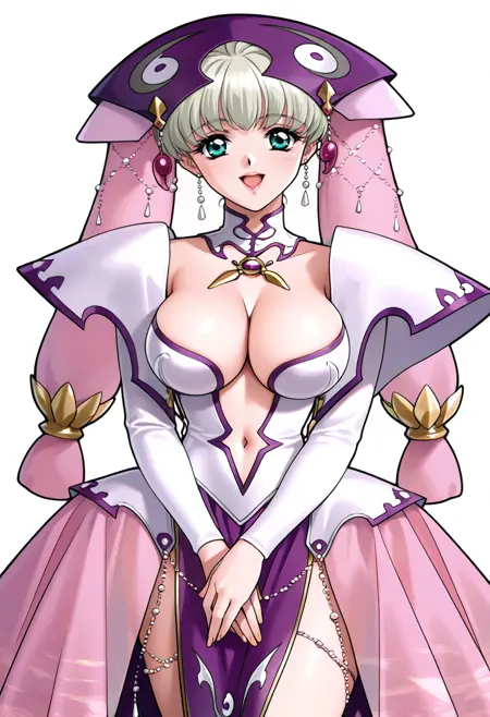 dress, detached collar, shoulder pad, long sleeves, cleavage, navel cutout, jewelry, purple pelvic curtain, pink showgirl skirt, headwear, neckless, large breasts, grey hair, bangs, aqua eyes, earrings, lips