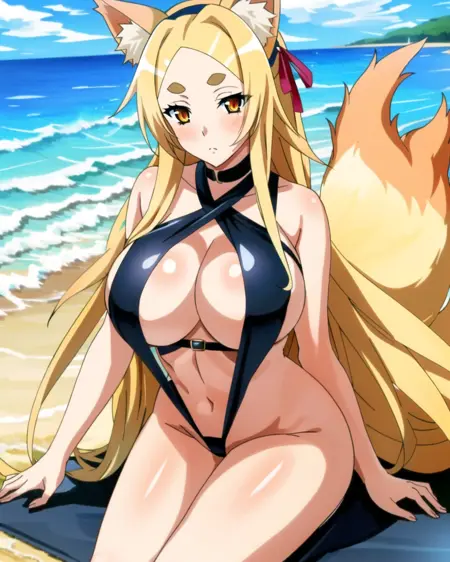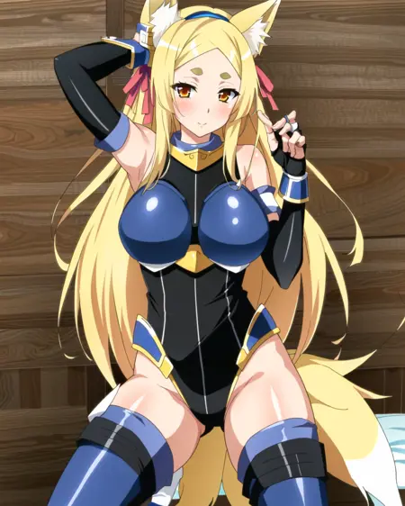 Yasaka:1girl,猫耳,橙眼,发饰,丝带,发带,黄眼,超长发,兽耳,Yasaka dxd,大胸,金发,长发,狐耳,尾巴,狐狸尾巴,多尾,狐娘,浓眉,