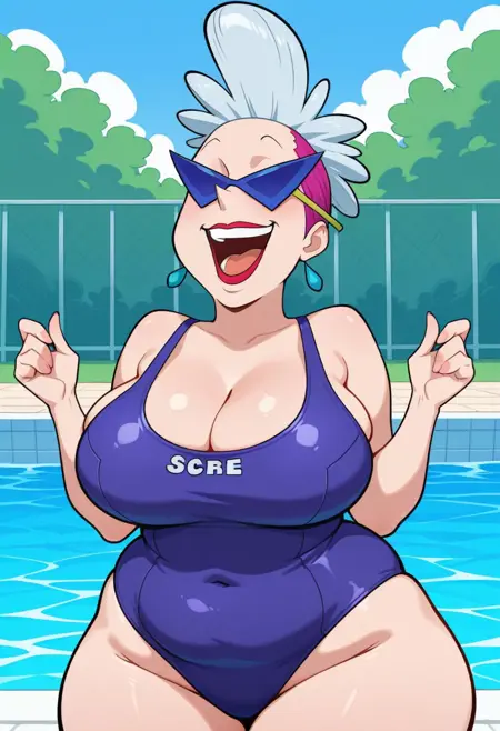 보라색 안경, 보라색 자켓, 파란색 셔츠, 분홍색 바지, 파란색 신발, 귀걸이