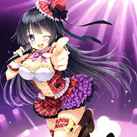 usagi, frilled dress, frills, ruffles, 1girl, one eye closed, solo, black hair, purple eyes, hat, long hair, breasts, open mouth, microphone, smile, large breasts, navel, cleavage, blush, pointing, skirt, ;d, top hat