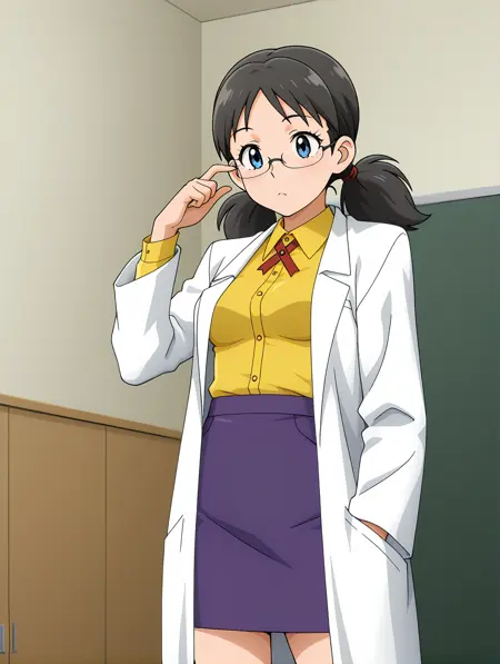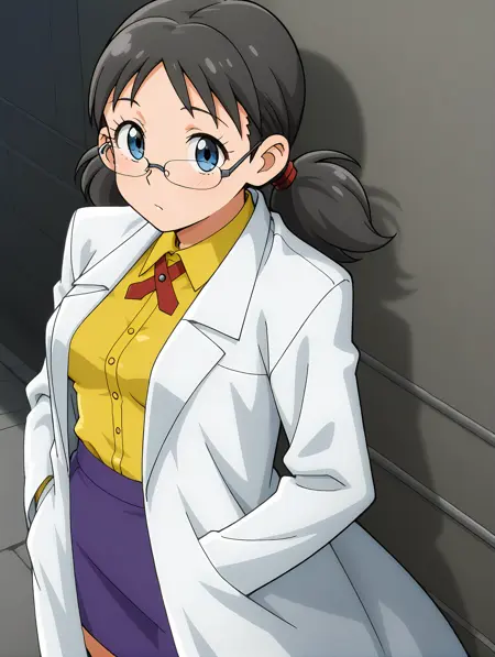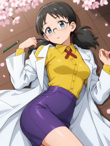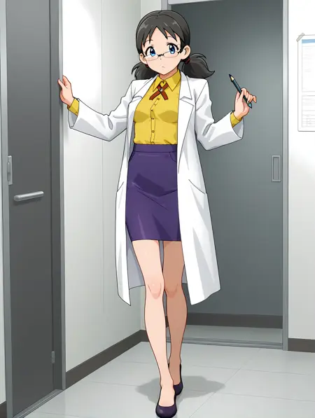 ラボコート、黄色のシャツ、赤いリボン、紫のスカート、鉛筆スカート