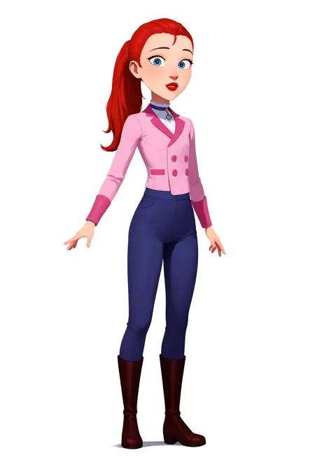 Horse Riding outfit prompts : ponytail, pink jacket, blue pants, boots, long sleeves