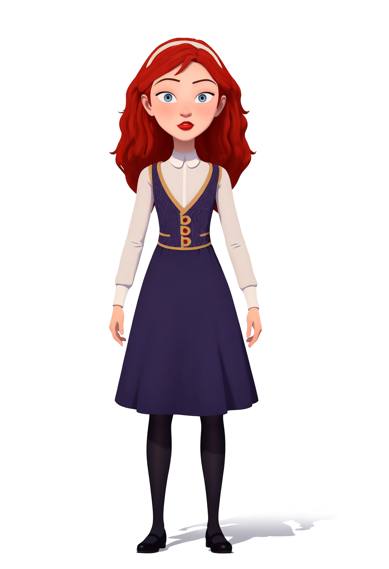 Basic Outfit prompts : hairband, white shirt, purple vest, purple dress, long sleeves, black pantyhose, black shoes