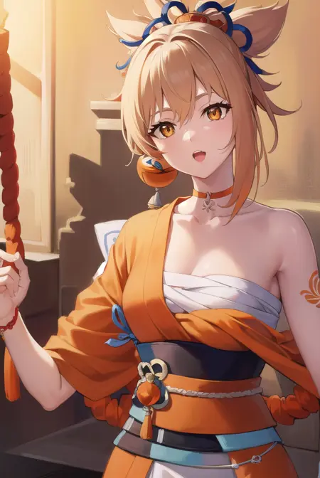 yoimiya, 팔 문신, 촐커, 머리 장식, 연한 갈색 머리, 긴 머리, (주황색 눈:1.5), 빨간 촐커, 옆머리,