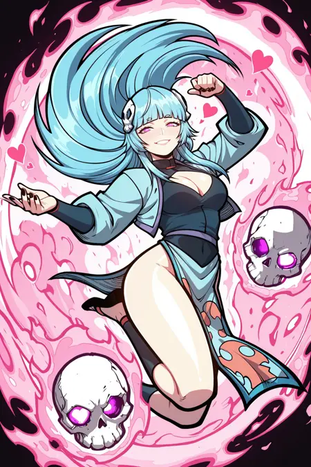 Trigger : YiLing, long hair, blue hair, blunt bangs, skull hair ornament, purple eyes, Dress, crop jacket, long sleeves, cleavage cutout, cleavage, arm guards, black nails, bone on hip, pelvic curtain, leg warmers, geta