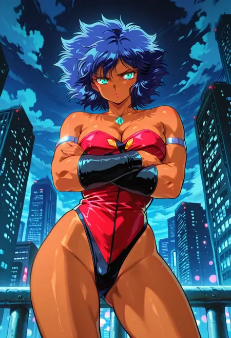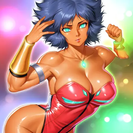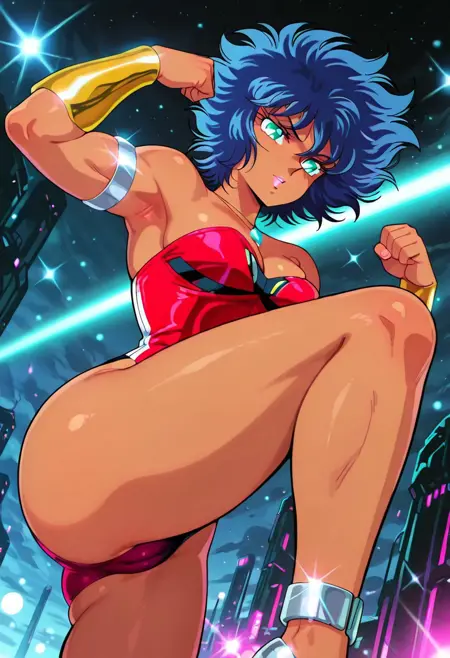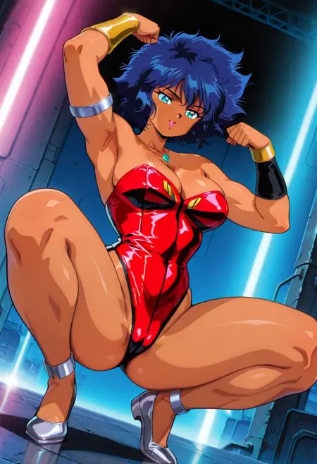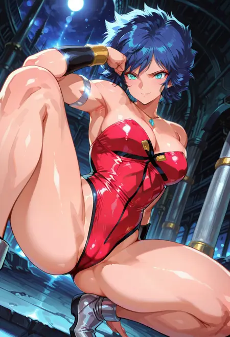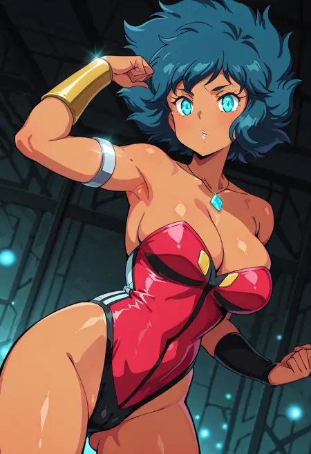 PaiThunderHTD, 1girl, solo, curvy body, muscular female, dark skin, dark-skinned female, blue hair, short hair, messy thick hair, bangs, aqua eyes, lips, necklace, pendant, large breast, cleavage, red leotard, sleeveless, strapless, large butt, thick thighs, bracers, silver anklet, silver shoes, silver armlet, highleg,