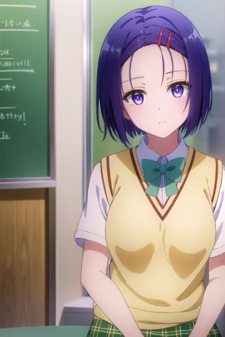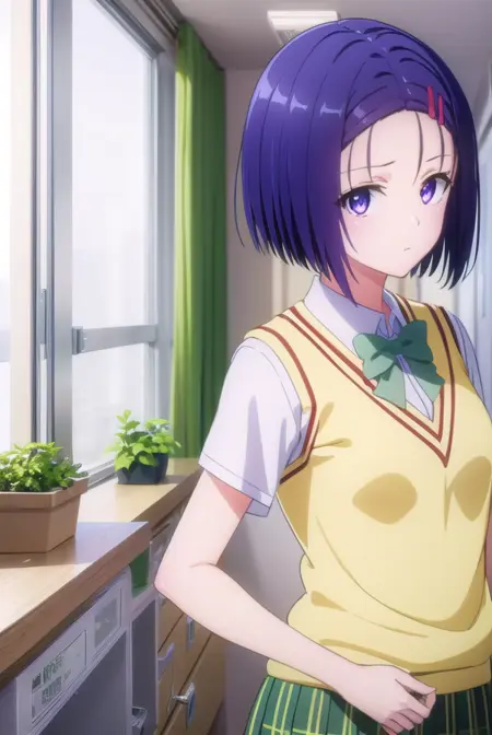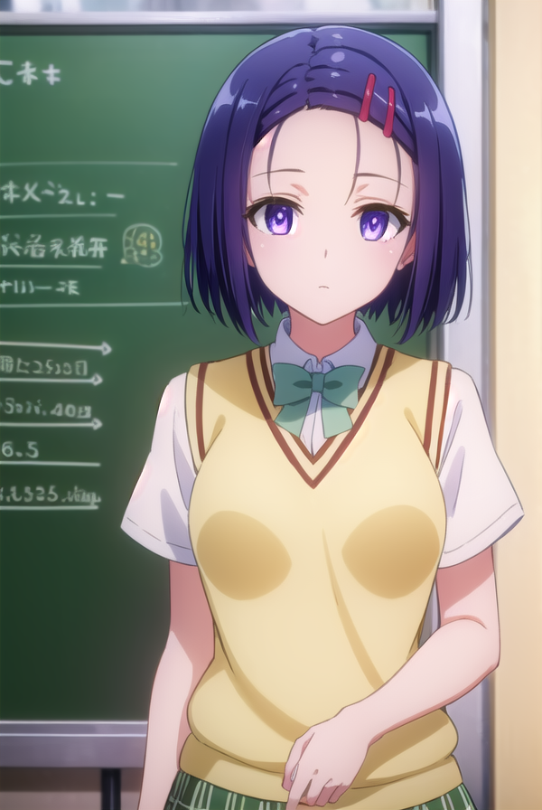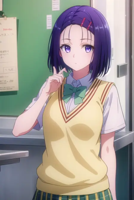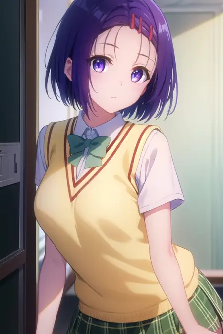haruna sairenji, hair ornament, hairclip, (purple eyes:1.1), purple hair, short hair, swept bangs, (forehead:1.3),