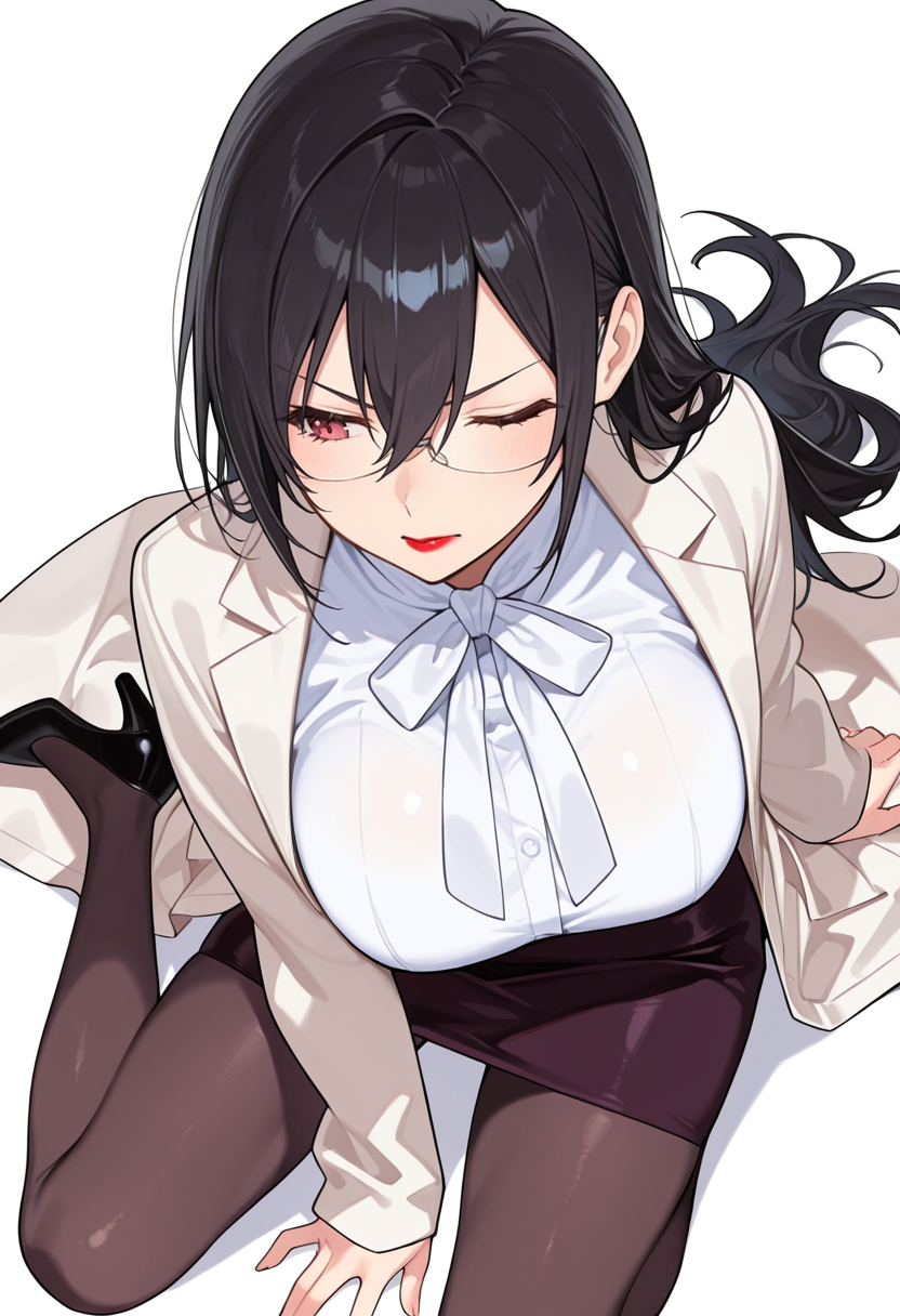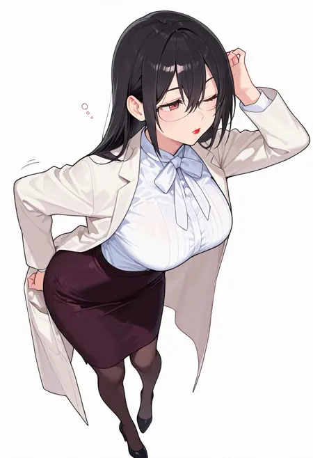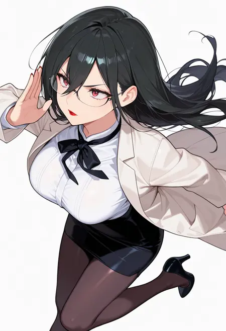 semi-rimless eyewear, opaque glasses, white shirt, labcoat, pencil skirt, black pantyhose, long sleeves, ribbon, high heels,