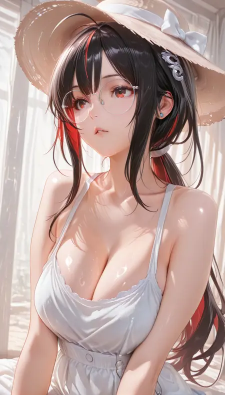 NIKKEMoran, long hair, breasts, large breasts, black hair, hair ornament, red eyes, , ahoge, ponytail, multicolored hair, earrings, red hair, parted lips, streaked hair, orange eyes, mole under eye, hair scrunchie, round eyewear, sidelocks, glasses, oriental dragon ornament,