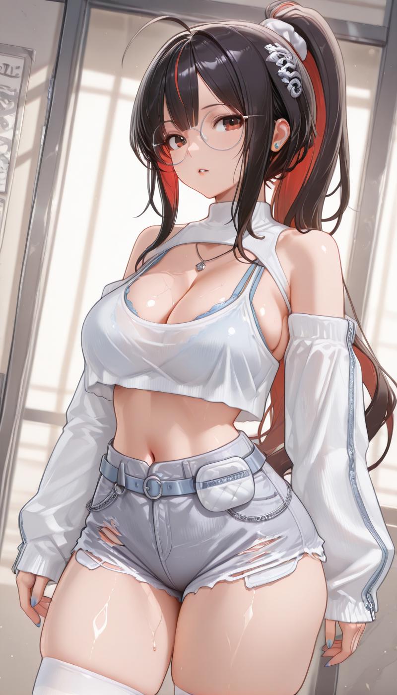 shirt, long sleeves, thighhighs, navel, cleavage, jewelry, bare shoulders, white shirt, thighs, detached sleeves, shorts, midriff, stomach, necklace, white thighhighs, sweater, crop top, sleeves past wrists, clothing cutout, book, short shorts, turtleneck, cleavage cutout, denim, holding book, blue shorts, denim shorts, pouch, white sweater, shoulder cutout, crop top overhang, grey shorts, cutoffs, glitch, torn shorts, cropped sweater, white pouch, zipped sleeves, zipper, zipper handle, ribbed sleeves, rectangle pouch, pouch strap, blue strap, waist strap, fingernails, blue nails, nail polish,