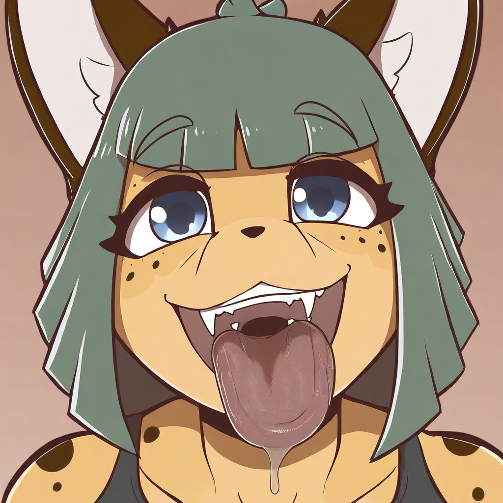 cheetah, yellow fur, spotted fur, black spots, green hair, blunt bangs, blue eyes, black ears, cheetah tail, large breasts,