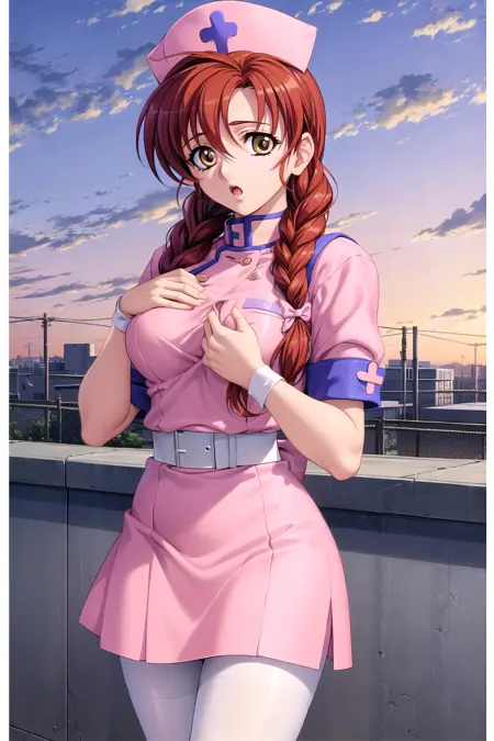 Normal costume: 1girl, twin braids, hair bow, large breasts, cap, pink nurse, name tag, white belt, pantyhose