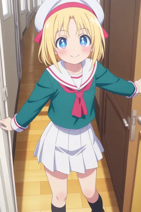 lily baker, 1girl, solo,looking at viewer, blonde hair, short hair, blue eyes, blush, beret, red ribbon, teal school uniform, serafuku, sailor collar, red neckerchief, long sleeves, white skirt, pleated skirt, knee socks, brown loafers,anime_screenshot,