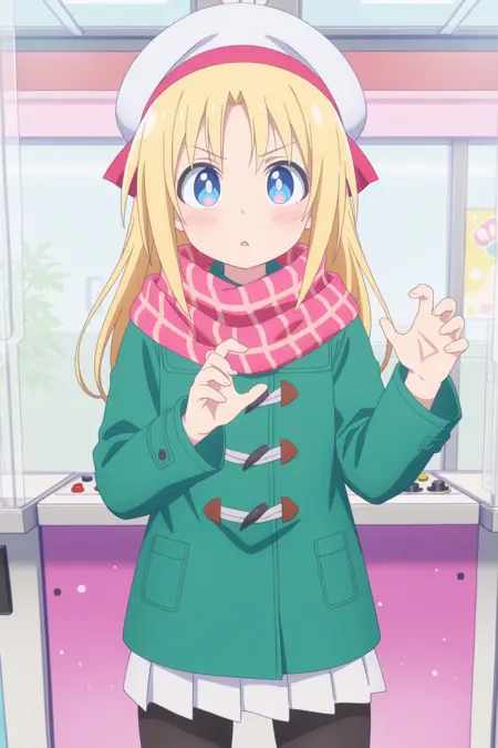 lily baker, 1girl, solo, blonde hair,blue eyes, medium hair, beret, red ribbon,  black pantyhose, pink scarf, plaid scarf, green coat, duffle coat,anime_screenshot,