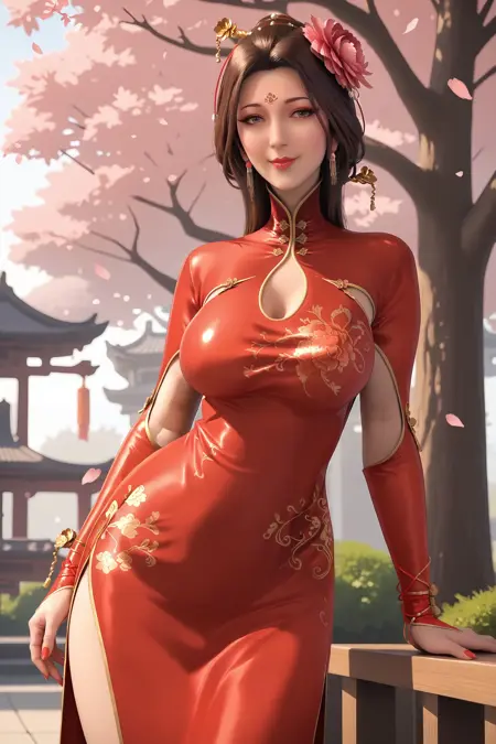 1girl, solo, hair ornament, dress, chinese clothes, flower, long hair, china dress, jewelry, hair flower, earrings, brown hair, red dress