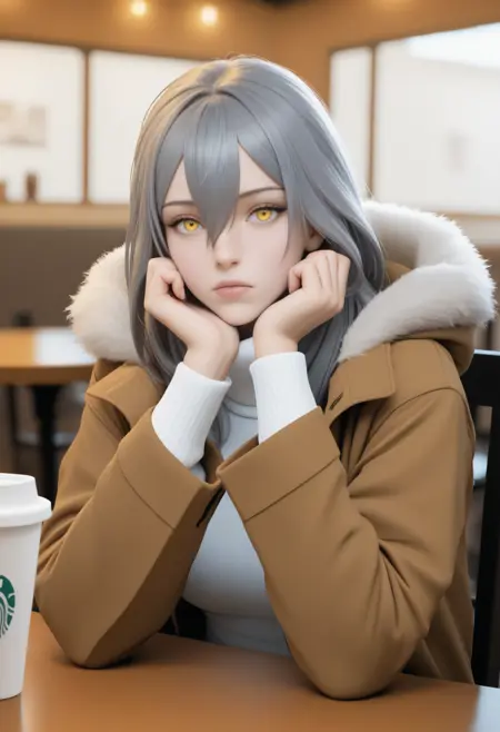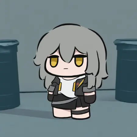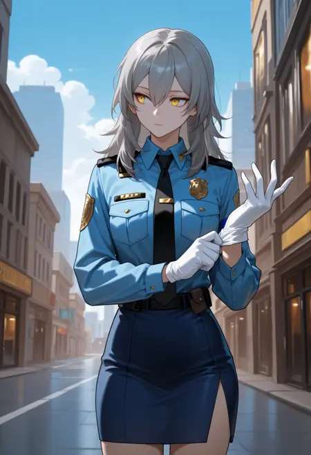 默认服装: st3ll3def, 长发, 灰发, 发丝遮眼, 黄眼, 黑色夹克, 开襟夹克, 卷起袖子, 白色衬衫, 黑色手套, 黑色短裙, 超短裙, 大腿绑带, 锁骨