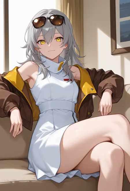 2023世界巡演: st3ll3dress, 长发, 灰发, 发丝遮眼, 太阳镜, 眼镜戴在头上, 黄眼, 棕色夹克, 开襟夹克, 露肩, 长袖, 短裙, 白色连衣裙, 高领连衣裙, 无袖连衣裙, 棕色包, 单肩包, 露肩